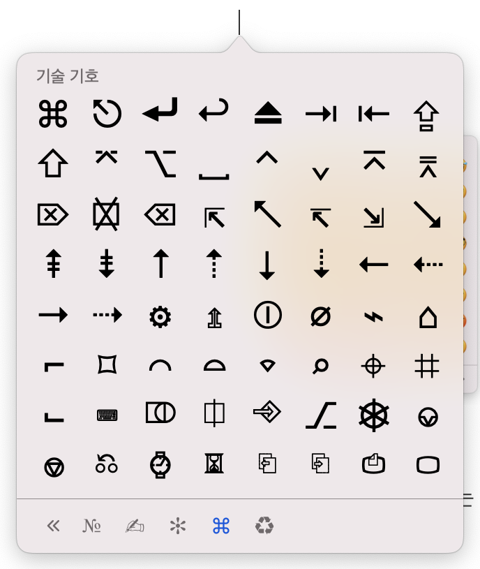 입력창에서 fn키를 누르면 아래 그림과 같이 스마일리 및 사람을 입력 할 수 있는 창이 뜹니다. 아래 카테고리에서 기술 기호를 선택 하면 아래와 같이 command, shift, controll, option 등의 여러가지 mac 키보드 기호를 입력 할 수 있습니다.